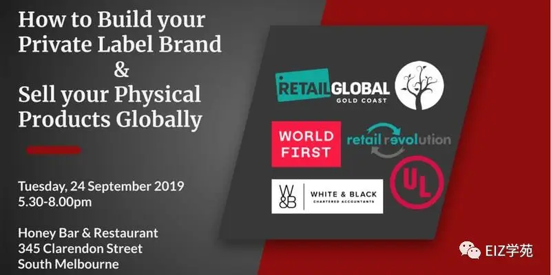 Tuesday 24 September, 2019 from 5:30pm 地址: Venue: Honey Bar & Restaurant, 345 Clarendon Street, South Melbourne, 3205 报名链接: https://www.eventbrite.com.au/e/private-label-meetup-tickets-72135339743 也可咨询eiz官方微信:eizptyltd 本次活动邀请到了众多知名的亚马逊周边产业服务商,包括品牌认证,财会,支付,进出口以及数据支撑等板块。意在帮助各位深度了解亚马逊运营的游戏规则及操作技巧,以更好的打造自有品牌,冲出澳洲,面向全球。 同时会场提供免费酒水小食,为大家提了一个更为轻松亲近的沟通氛围。