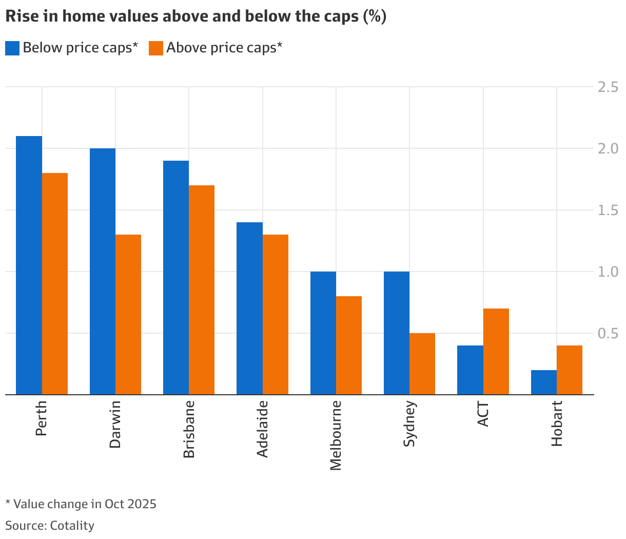 Cotality的分析显示,价格低于政府扩大后首置房担保计划上限的住房,10月全国上涨1.2%,而高于上限的房产则上涨1%。