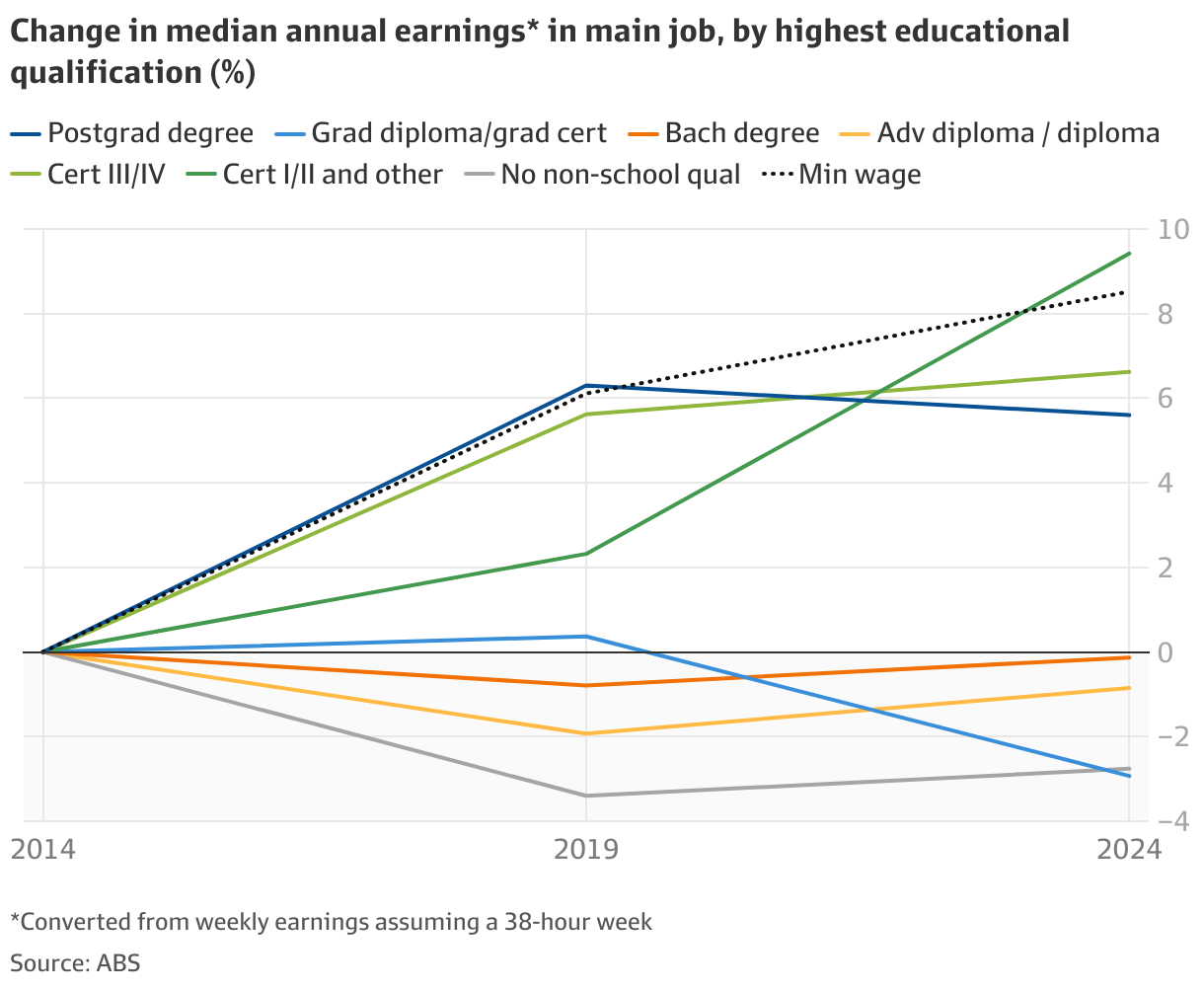 当我们查看自2014年以来,按最高学历分组、剔除通胀后的工资中位数变化百分比,就能理解原因。