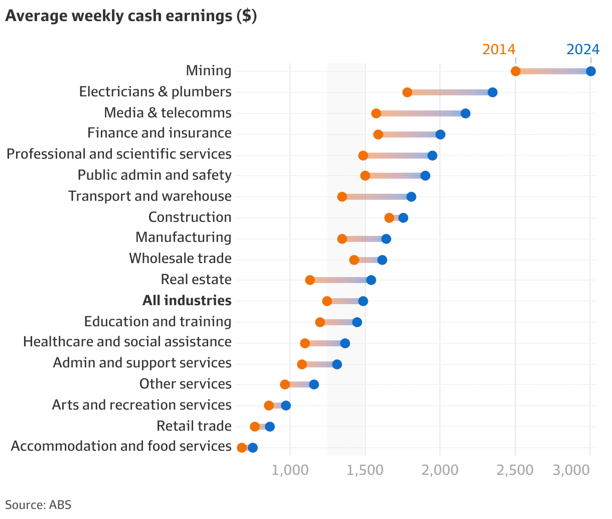 电工、水管工和垃圾处理工的工资大致持平。矿业工资涨幅低于通胀,但整体水平仍然很高。