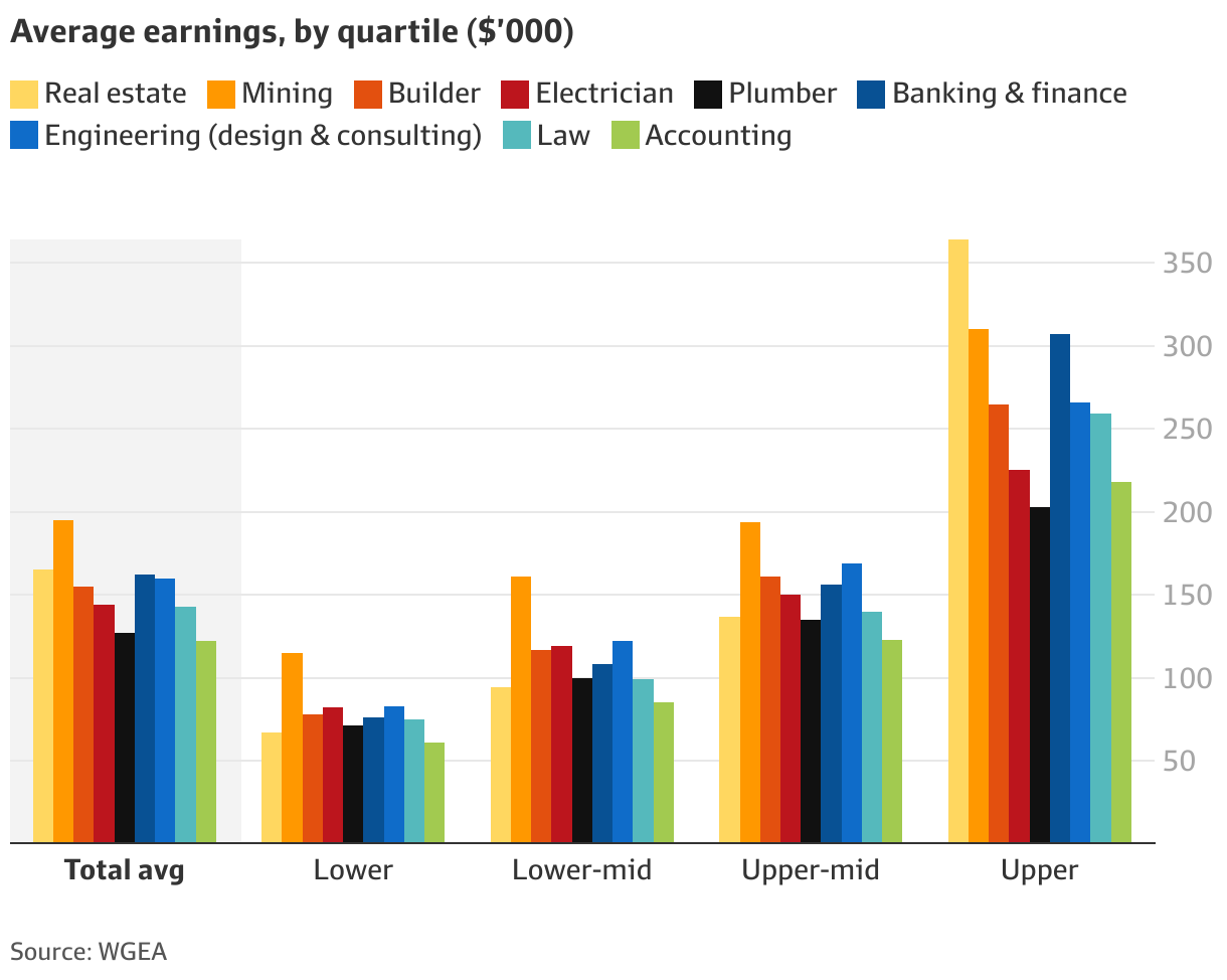 为了弄清楚哪条路“起步最划算”,以及谁有机会拿到“最高的未来收入”,我们参考了工作场所性别平等署(Workplace Gender Equality Agency,WGEA)的数据,这些数据把薪酬按四分位数区间来分布。