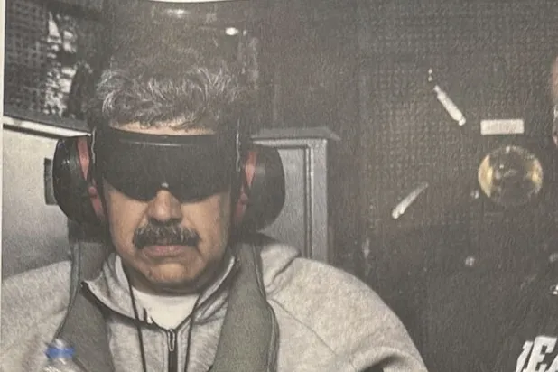 周六上午,特朗普开记者会前几分钟发帖,发了一张马杜罗的照片。照片里他穿着耐克运动服,眼睛被蒙住,双手看起来被捆在一起,旁边站着一名美国缉毒局人员。
