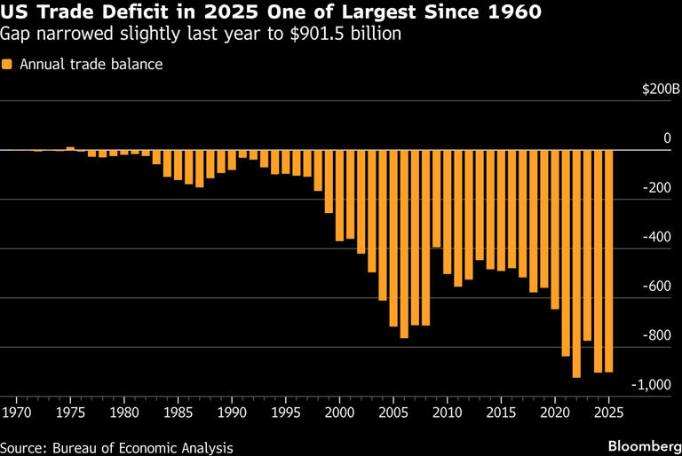 美国商务部周四表示,去年美国贸易逆差,也就是商品与服务进出口之间的差额,为9015亿美元,略低于2024年的9035亿美元。如此微小的变化表明,至少到目前为止,即便政策在一年内发生剧烈转向,美国作为“净进口大国”的角色仍未改变。