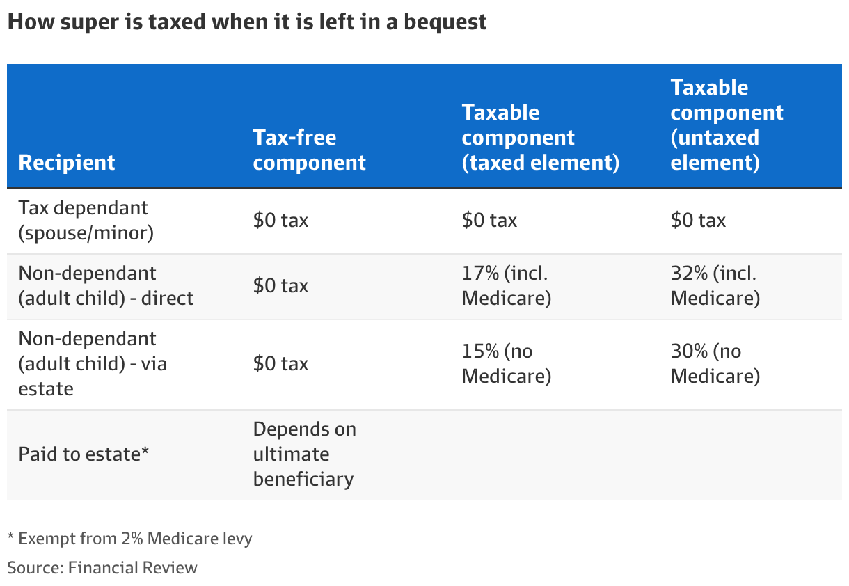 这项税是在Super内部各种税都扣完之后才对遗赠款项征收的,其中也包括拟议的新Division 296税。不管你是通过具约束力的受益人指定(binding nomination)直接把钱留给受益人,还是通过遗嘱把钱留给受益人,都会触发这项税。不过,如果走遗嘱路径,会有一个小优惠:不用再交2%的Medicare levy。