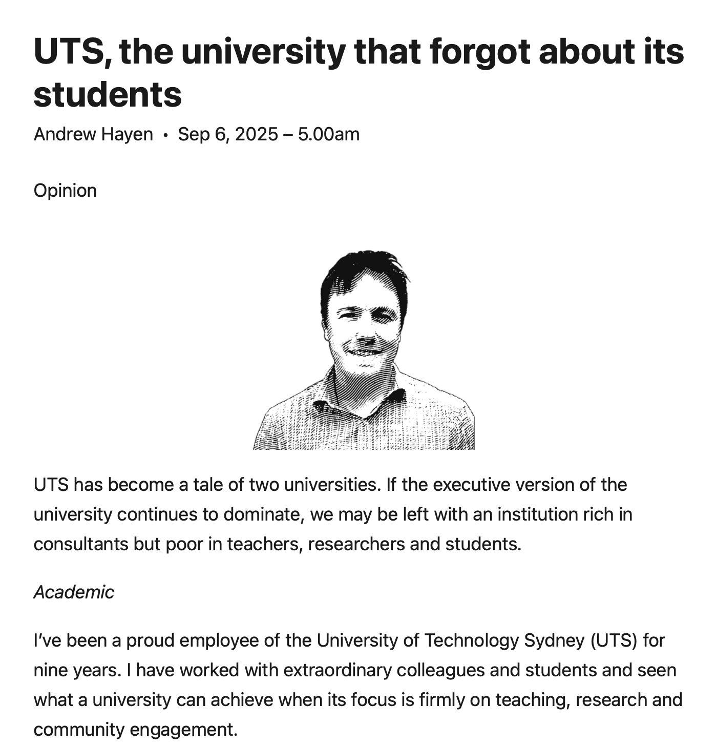 澳洲金融时报:悉尼科技大学忘了学生 悉尼科技大学正在成为“两所大学”的故事。 如果高层主导继续下去,它可能只会留下一个富有顾问,却缺乏教师、研究员和学生的机构。 我在UTS工作了九年,一直为此自豪。 我与卓越的同事和学生们共事,见证了当一所大学把重心放在教学、科研和社会参与时能取得的成就。 然而今天,UTS似乎不再作为一个统一的机构运作。 它像是两所大学,并肩存在,却走向截然不同的方向。 第一所是大家熟悉的大学:日常的课堂、实验室、办公室和图书馆。是学术和行政人员齐心协力,为学习和发现创造条件。 它是讲座与辅导,是深夜批改作业,是指导博士生,是无数没有报酬的时间里准备科研基金申请或修改论文。 它也是专业人员支撑的运转,确保系统正常、学生获得需要的支持。也是学生们在图书馆奋战,担忧考试,思考未来人生。 这个版本的大学是真实而有形的,它在不断压力下依旧存在。员工们互相关心,分享资源,竭尽所能让学生不被压垮。学生们也注意到这一点。 近几周,一些学生直接问我他们能做些什么来支持我们。 这个简单的问题提醒我们,教育是一项共同事业: 教师与学习者组成的群体,共同相信教育与科研的价值。 大学当然要有财务责任,但责任不仅仅是平衡短期预算。 接着是另一所大学。大多数员工和学生看不见它,但它的影响深远。它是由高层管理主导的大学。 在这一版本的UTS里,重心放在财务管理之上。它由一群薪酬居公共部门顶端的人领导,且人数年年增加。 这个大学不会上课,不会批改,不会指导学生。它不会面对焦虑的本科生,解释为何课程被停办。它是一所属于顾问、预算表和“重组计划”的大学,这些计划被包装成“审慎的风险管理”。 这种“第二所大学”最明显的象征就是对顾问的大量花费。UTS已经支付毕马威760万澳元,还在2025年预算中为顾问拨款数百万,专门用于人员裁减计划。 这些数字很难与所谓的“财务困难”相符。更难以理解的是,同时却决定停办教师教育、公共卫生和国际研究课程。 这些都是关乎公共利益的重要领域。教师教育关系到每个澳洲孩子的未来。公共卫生在新冠疫情中至关重要,将来也必然如此。国际研究则是我们与区域及世界互动的能力。砍掉这些课程不仅是UTS的损失,更是社会的损失。 这“两所大学”之间的分裂正在扩大。第一所大学依旧为公共利益支撑教育与科研。第二所大学却在作出影响两者的决定时,并不承担后果。课程停办时,要面对学生的不是高层,而是一线教职员。 这不只是内部士气问题。一旦课程停办、研究人员离开、协作文化被破坏,就很难重建。 大学的财务责任不应局限于平衡短期预算,还应顾及当下与未来学生的需求、国家重点学科的完整性,以及每天履行使命的员工福祉。 公众有权期待更多。大学获得大量公共资金,在社会中发挥关键作用。影响整个学科的决定,不应在关起门来的会议中,由只关心工时费用的外部顾问来决定。 当务之急是重新投入到第一所大学,也就是存在于教室、实验室与图书馆的那所。它才是大学的价值所在。它是学生所体验的,是雇主所依赖的,是高等教育公共投入的意义所在。 我仍然相信UTS的价值。我相信每天共事的同事和学生。 但我担心,如果高层版UTS继续主导,我们将只剩下一所顾问很多、教师与学生很少的机构。这不是我们任何人该接受的未来。 来源: https://www.afr.com/work-and-car ... nts-20250905-p5msm0 Andrew HayenAcademic Sep 6, 2025 – 5.00am |