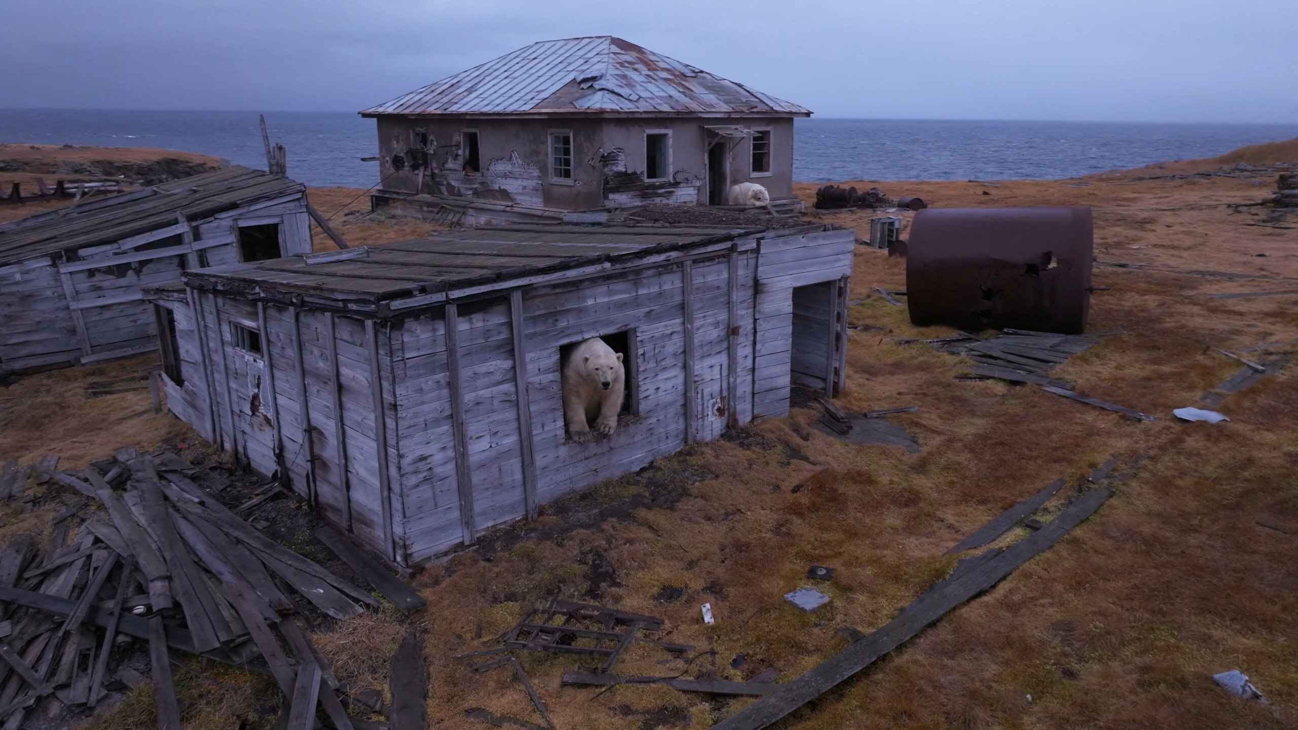 北极熊在俄罗斯的远东北海岸的一个小岛上占据了一个被弃的苏联时代的北极研究站。 旅行博主Vadim Makhorov本月在楚科奇海的科柳钦岛上无人机拍下了北极熊们在夏末的北极阳光下进进出出散落在岛上建筑的画面。 一头熊要去打靠近的无人机,其他的则好奇地从建筑物探出头来。 Makhorov说:“我想它们用这些房子来遮风挡雨。” 30多年前苏联解体后不久科学家们离开了这个被弃村落里的科研站。 Makhorov说岛上活跃着20多头熊。 北极熊大多独居,但它们并非天生反社会。 当它们不在争夺食物或性伴侣时,就会显出社会化的一面。 当没有足够的冰的时候,熊们在夏天进一步往北迁徙,并在陆地上搜寻食物。 Makhorov 说几年前一头鲸鱼的尸体吸引了200多头北极熊。 “大家都自己吃,不打扰别人”。 科学家们说因为海冰因气候变化继续融化,北极熊在陆地上的时间更长了。 https://www.abc.net.au/news/2025-09-28/polar-bears-take-over-abandoned-research-station-russian-arctic/105827636 |