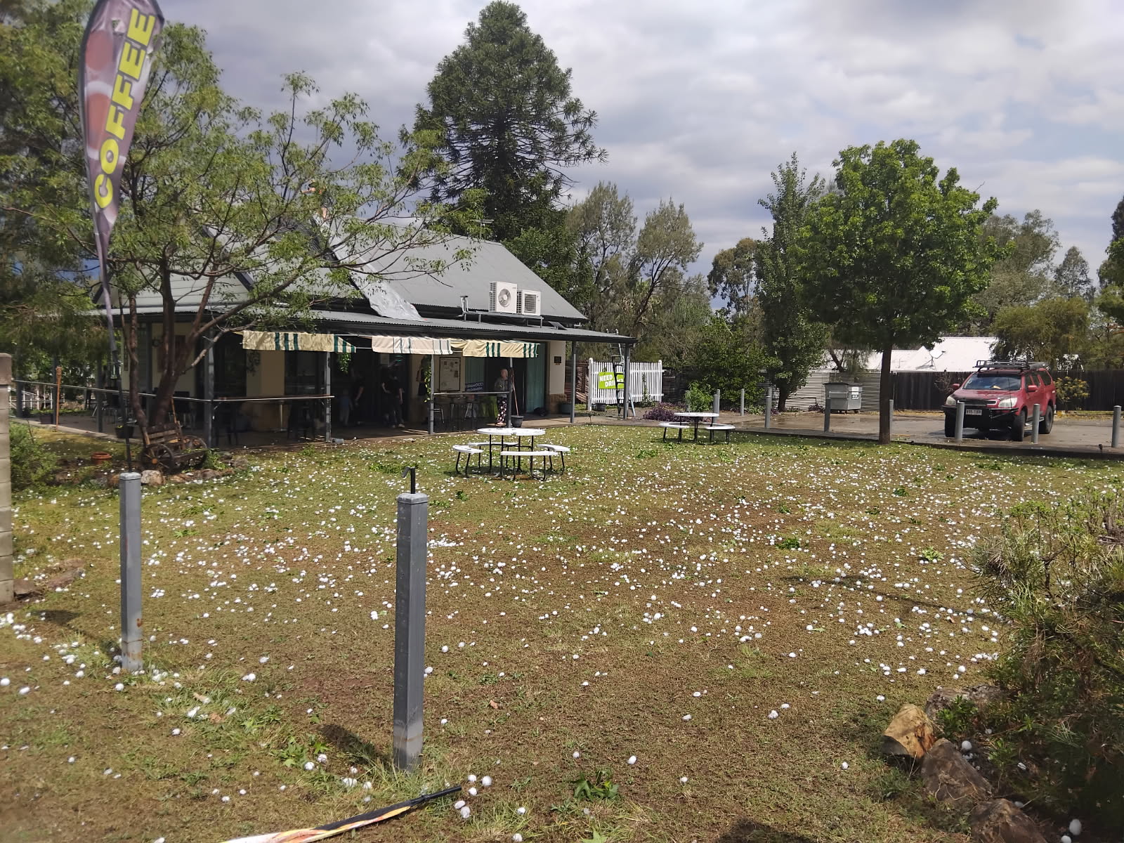 昆州东南部分地区遭到大冰雹、大雨和强风的打击。 Southern Downs地区Warwick以西下了直径9厘米的冰雹,大到足以破坏汽车和房屋。 在布里斯班以西2小时半车程的小镇的MJ咖啡馆的开张日因为“像网球那么大的冰雹”而变得一片混乱。 老板Richard Manley 说整个天花板“被暴打”。 “大家都藏身在厨房区域因为天花板掉在了酒吧区域。高尔夫球那么大的冰雹砸进柜台里。” 几辆车的前窗玻璃被砸。 https://www.abc.net.au/news/2025-11-01/qld-thunderstorms-hit-south-east-saturday/105961034 |